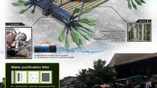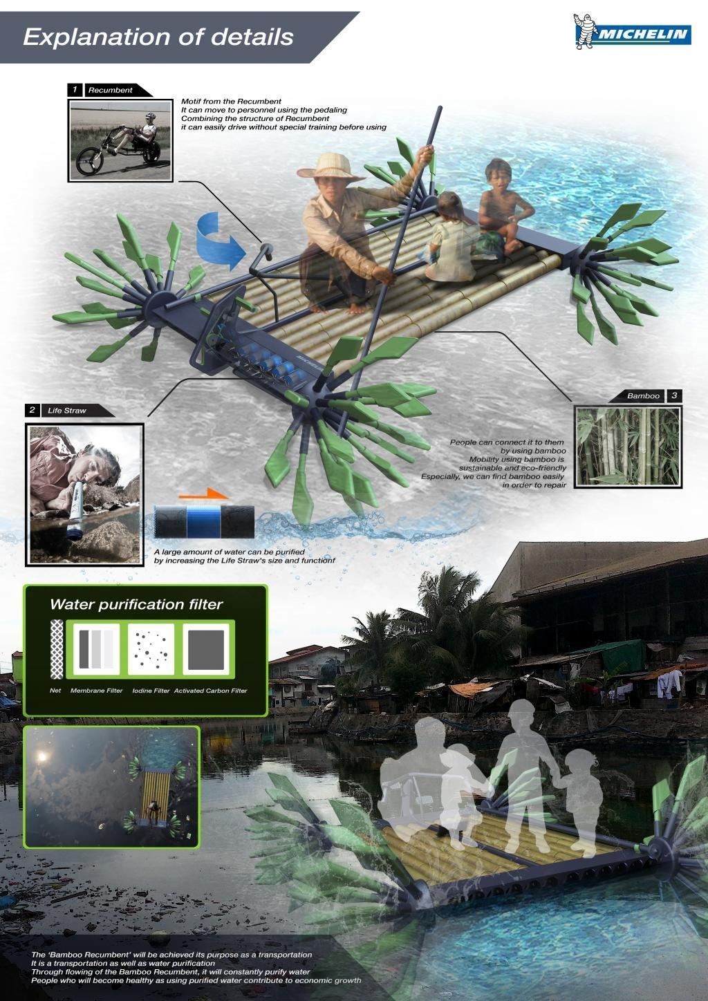 Третье место досталось команде из Южной Кореи, которая предложила идею бамбукового плота, приводимого в движение четырьмя двигателями, которые, кроме того, фильтруют воду.