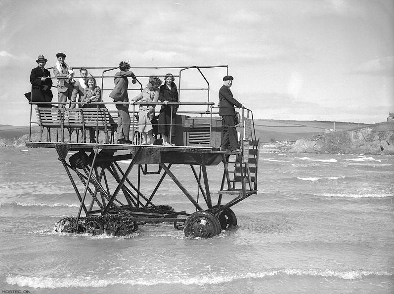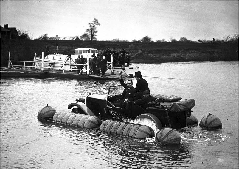 5 — Капитан Малин на амфибии Riley спускается по реке Северн. Автомобиль установлен на переносной надувной системе и передвигается за счёт вращения задних колёс с небольшими лопастями.