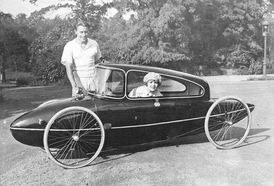 20 — Доктор Манфред Карри рядом со своим изобретением — Curry-Landskiff. Этот веломобиль был способен развивать скорость до 55 км/ч.