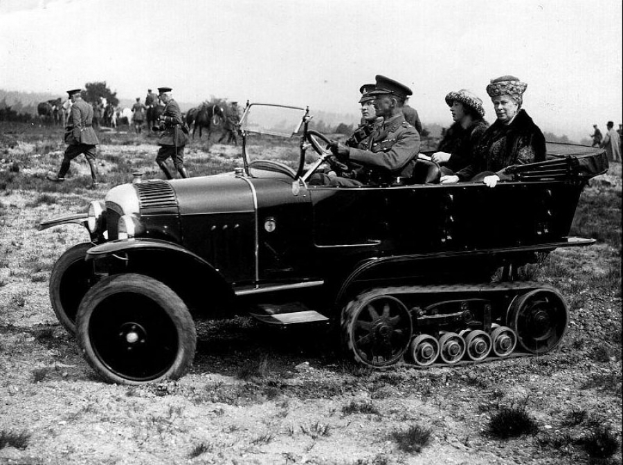 34 — Королева Мария (1867–1953) и принцесса Мэри (1897–1965) передвигаются по пересечённой местности на гусеничном автомобиле, управляемом армейскими офицерами.