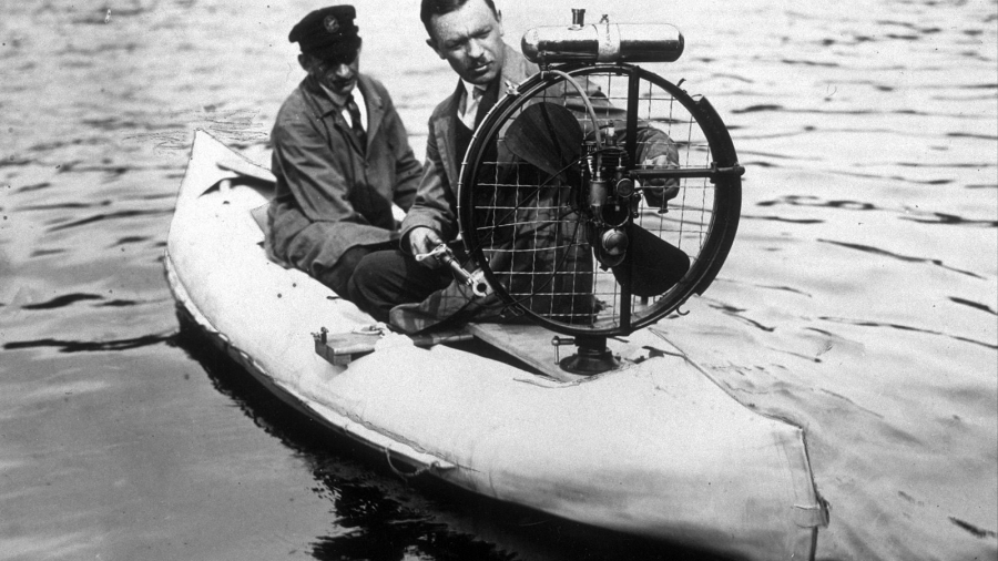 47 — Надувное моторизованное каноэ с воздушным пропеллером, испытываемое изобретателем в 1935 году.