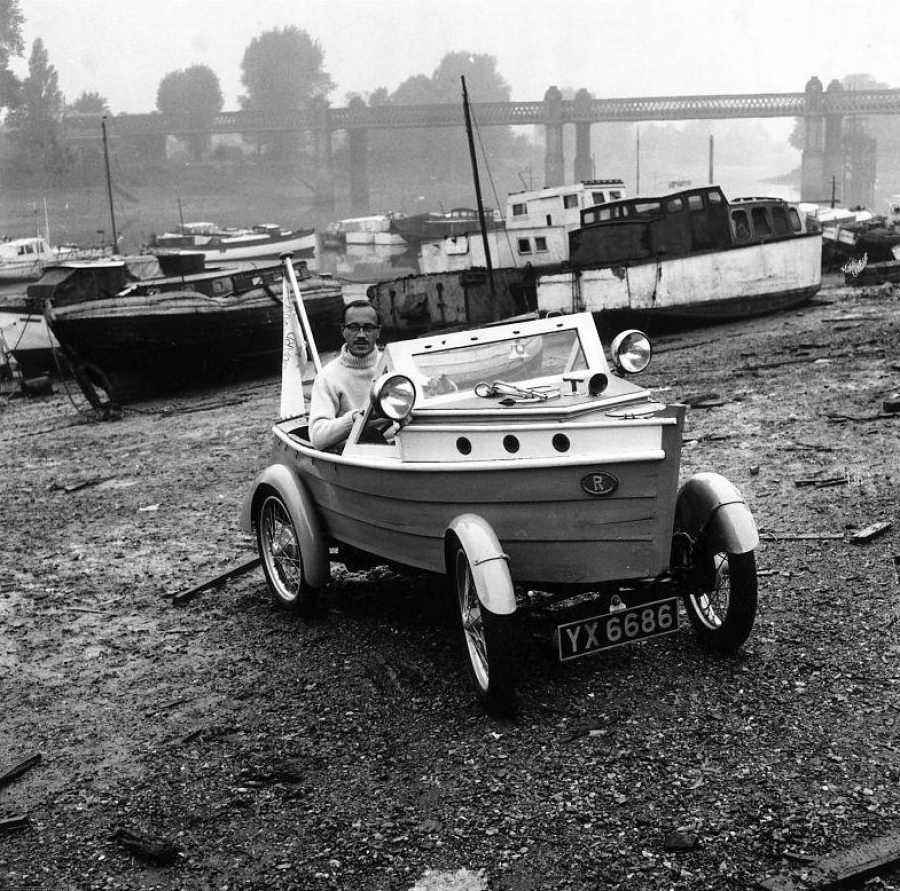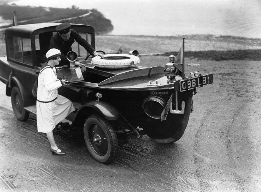 31 — Автомобиль-лодка Peugeot на берегу реки. Передняя часть выполнена как нос лодки, центральная — как автомобиль, при этом у него есть колёса.