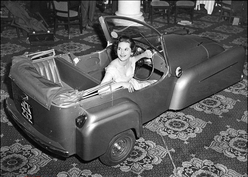 50 — Модель Гей Макгрегор демонстрирует новейший трёхколёсный Bond Minicar 1956 года в Лондоне.