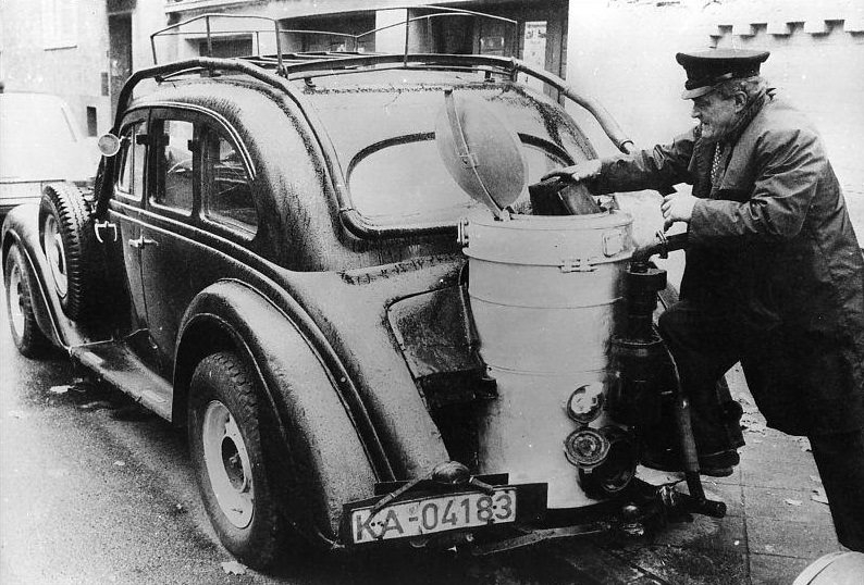12 — Автомобиль Adler Diplomat, построенный в Германии в 1936 году, с двигателем, работающим на древесном топливе вместо бензина, установленным во время Второй мировой войны.