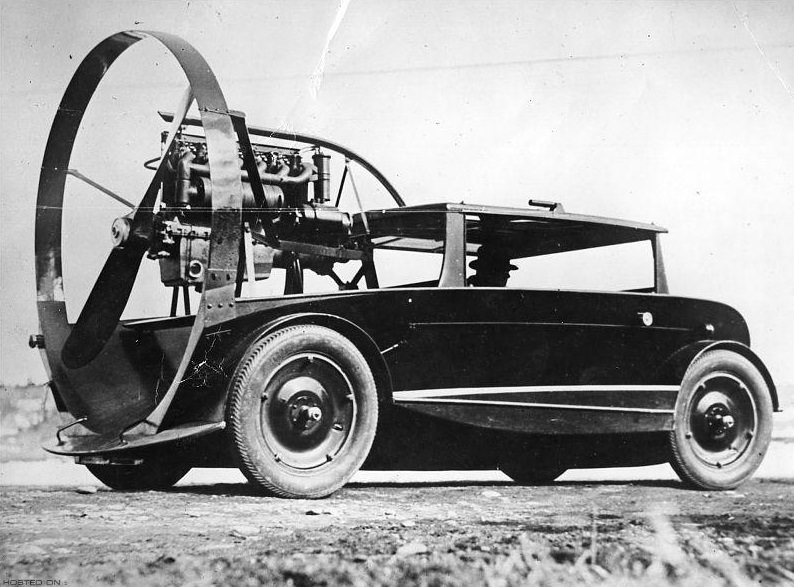 40 — Автомобиль-подводная лодка, способный передвигаться по суше и под водой, оснащённый двигателем мощностью 4 л.с. и стальными плавниками по бокам.