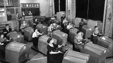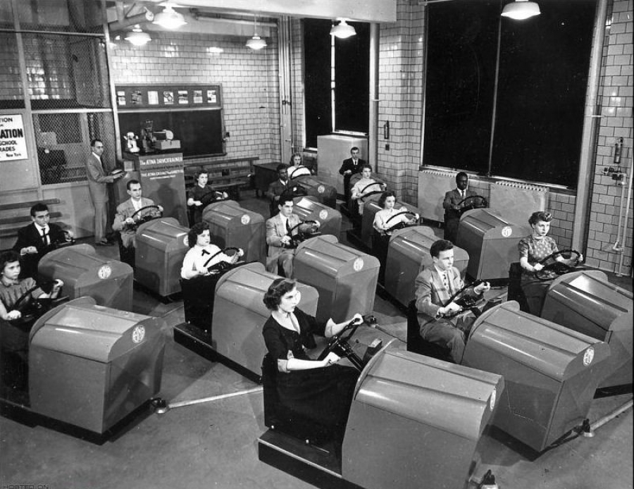 11 — Ученики старшей школы в Бруклине, Нью-Йорк, учатся управлять автомобилем и отрабатывают дорожные ситуации, проецируемые на экран, с помощью тренажёров Aetna Drivotrainer.