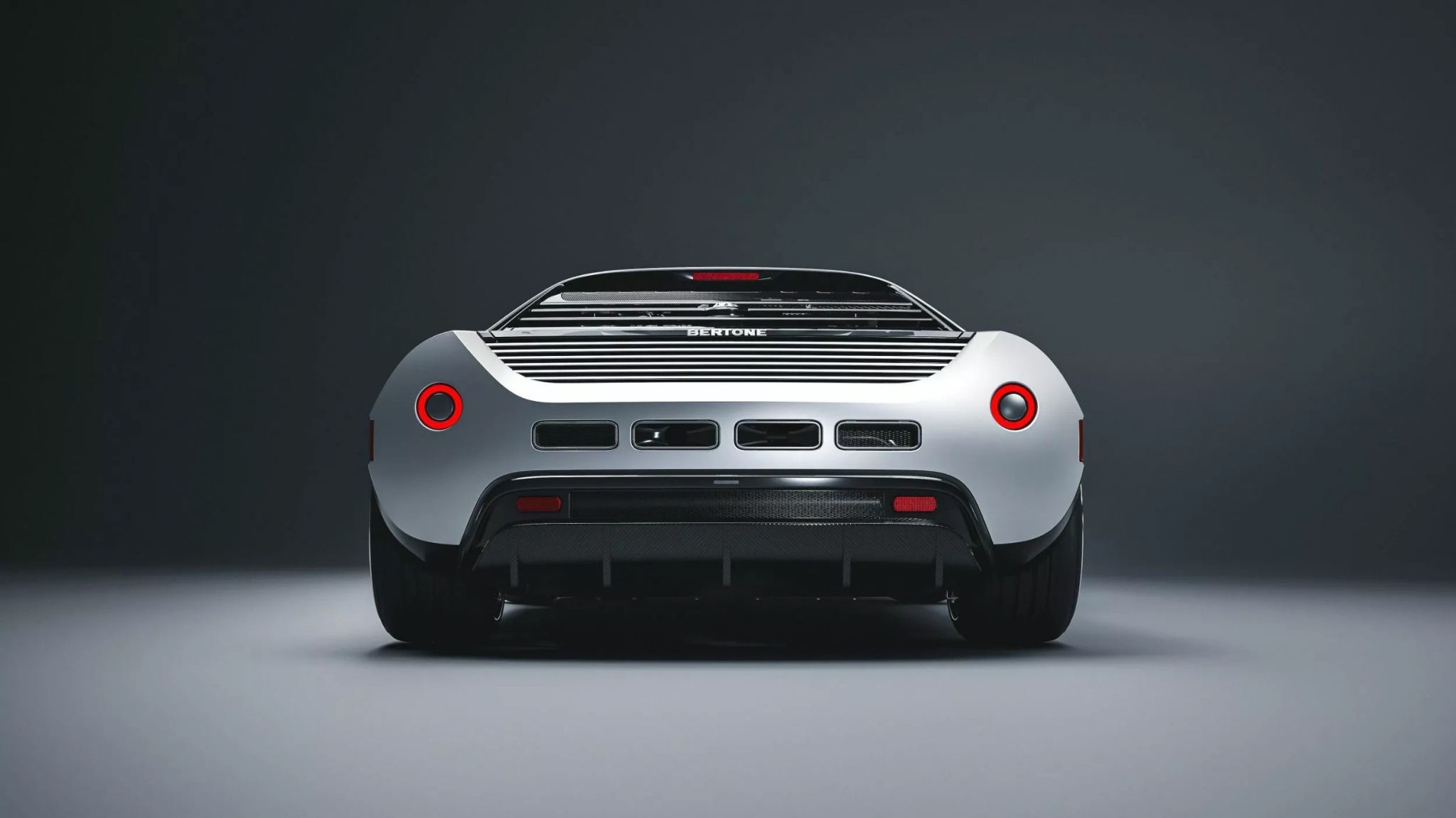 Скульптурная дуга безопасности переходит в короткую корму с круглыми фонарями и крышкой моторного отсека в винтажном стиле. Широкие шины лишь частично прикрыты минималистичным бампером, обрамлённым карбоновым диффузором. Над ним — четыре прямоугольных выреза, два из которых служат выходами выхлопа.