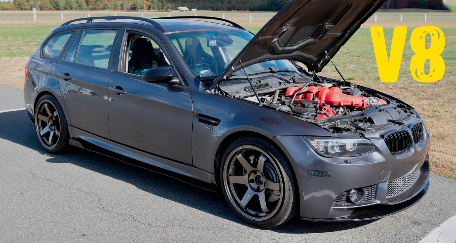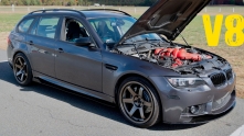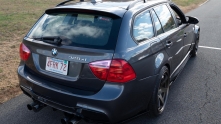 Подвеска занижена на пружинах H&R, спереди стоят тормоза уровня E90 M3, колёса — Volk Racing TE37SL. Внешне универсал тоже «подтянули» под M-стиль: бампер М3, крылья E90 M3, пороги, задний бампер от M, диффузор, капот из карбона, затемнённые отражатели и чёрные решётки радиатора.