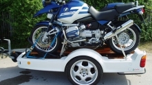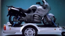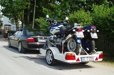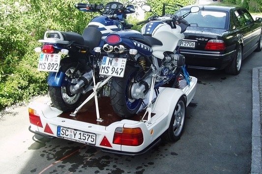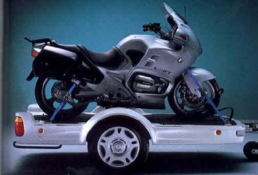 К счастью, BMW подумала и выпустила мотоциклетный комплект для Multi-Trailer. Он состоял из обруча для переднего колеса и креплений, и на самом деле выглядел как отличный способ буксировать мотоцикл за спортивным седаном.