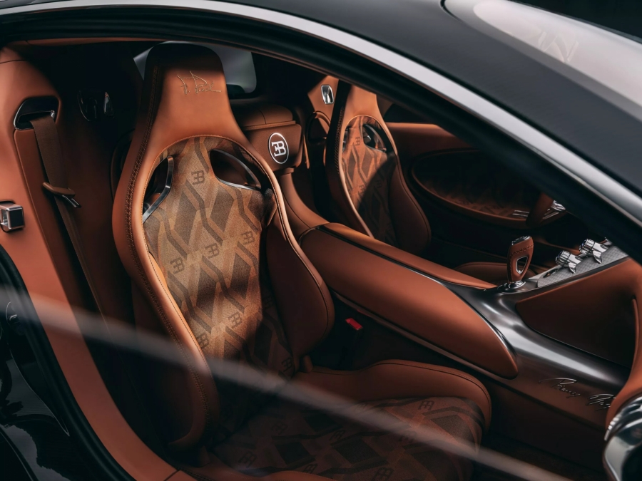 В салоне Bugatti идёт наперекор традиции «кожа везде». Рулевое колесо и уникальная алюминиевая центральная консоль выточены из цельной заготовки, а вместо сплошной кожаной отделки используются специально разработанные в Париже тканые материалы, придающие интерьеру более тёплое и индивидуальное ощущение.
