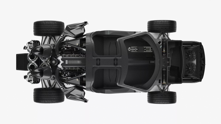 Результат — более 900 л.с. (662 кВт) и 1000 Нм крутящего момента. При массе менее 1200 кг (примерно как Mazda MX-5 RF с жёсткой крышей) это обещает взрывную динамику: разгон до 100 км/ч — менее трёх секунд, максимальная скорость — 360 км/ч.