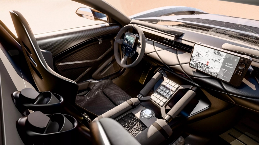 Это не просто шоу-кар. Под кузовом заявлен V8 мощностью около 1100 л.с. (820 кВт) и 1152 Н·м крутящего момента, вероятно с гибридной составляющей и турбонаддувом.