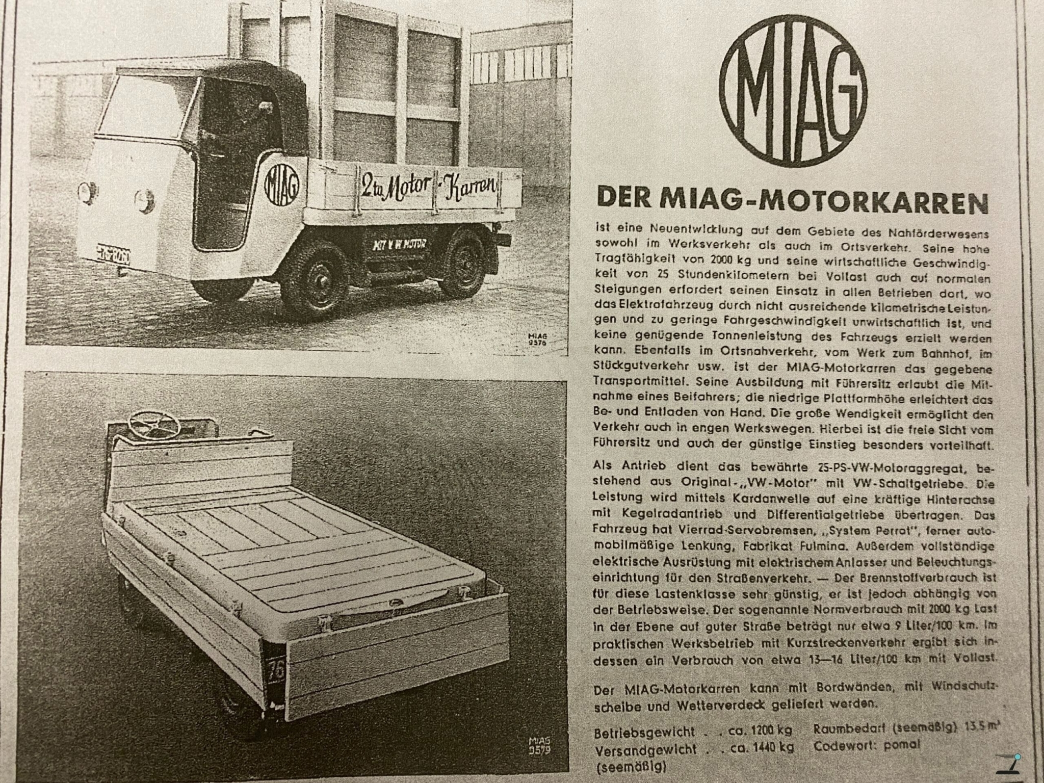 Но оставим в стороне фейерверки из погрузчиков. Сегодня речь о конкретном экземпляре — MIAG Motor-Karren. Он интересен по многим причинам, но прежде всего тем, что оснащён двигателем от Volkswagen Beetle — это 25 л.с. при рабочем объёме 1131 см³ и воздушное охлаждение.