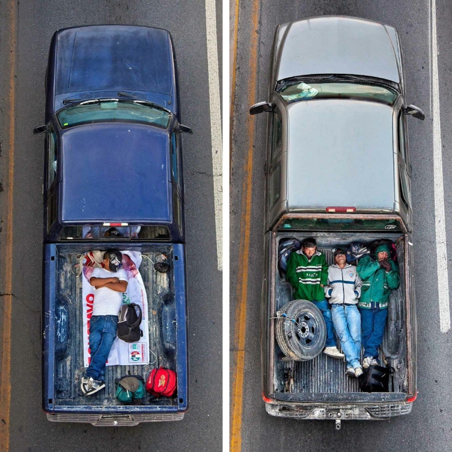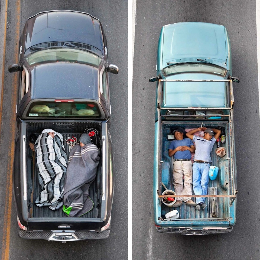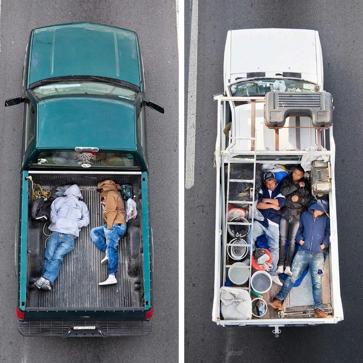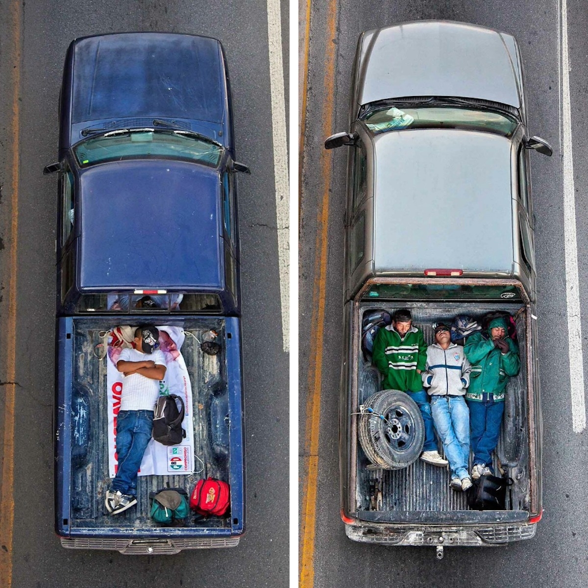 В серии Carpoolers мексиканский фотограф Алехандро Картахена снимал с эстакады в Монтеррее утренний трафик, в частности пикапы. Рабочие, лежащие в кузовах, показывают нам жизни, которые обычно остаются незамеченными.