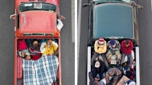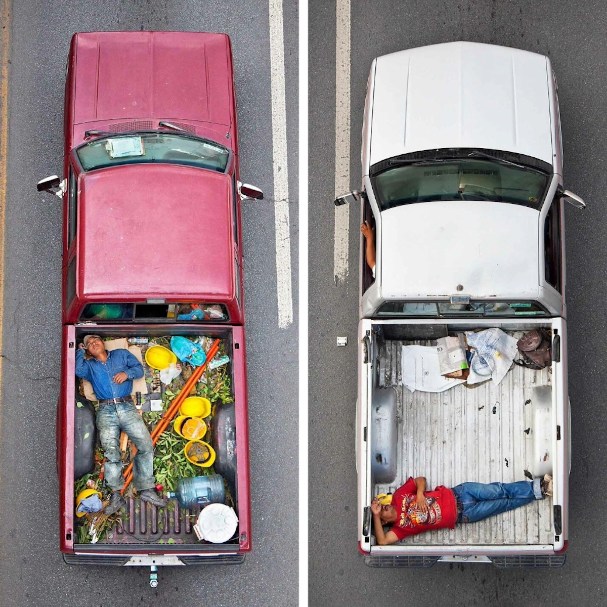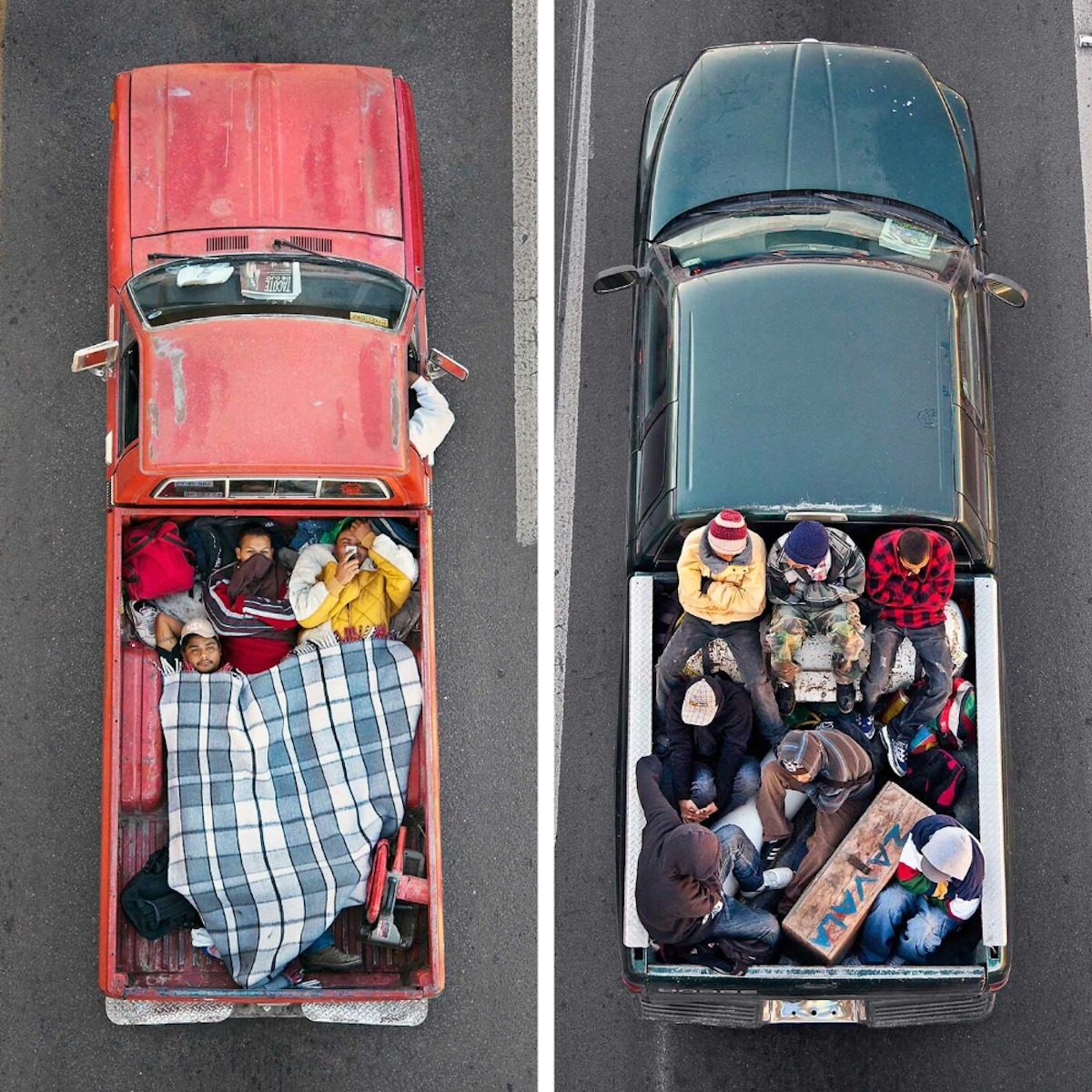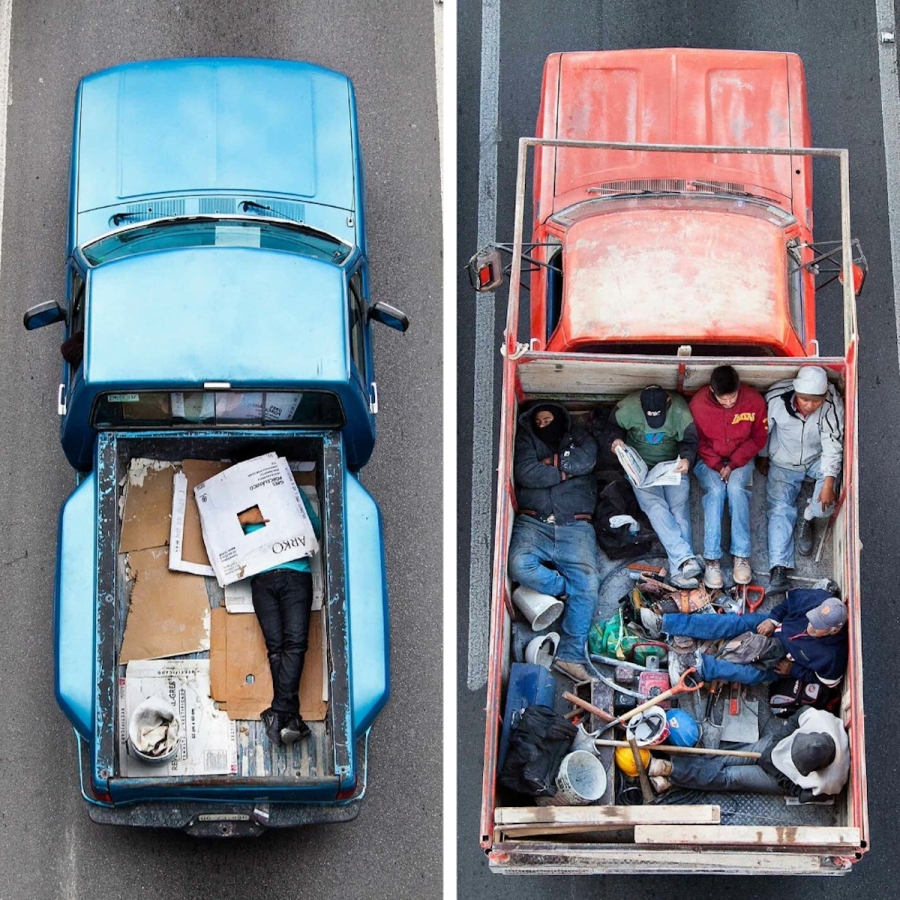 В серии Carpoolers мексиканский фотограф Алехандро Картахена снимал с эстакады в Монтеррее утренний трафик, в частности пикапы. Рабочие, лежащие в кузовах, показывают нам жизни, которые обычно остаются незамеченными.