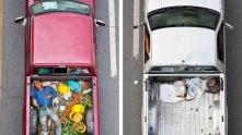 «Рабочие покупали дома в часе езды или даже дальше от места работы, при том что общественного транспорта не было. Поэтому я начал документировать то, как люди используют свои автомобили, — говорит Картахена. — Как они ездят на работу и возвращаются домой, как персонализируют машины в зависимости от района, в котором живут. И я стал смотреть на автомобили сверху — с домов и мостов».