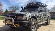 Среди других внедорожных атрибутов можно отметить мощную переднюю стальную защиту, багажник на крыше, шноркель и защитный камуфляж серо-черного цвета. Кроме этого, спереди вы насчитаете 7 дополнительных фонарей.