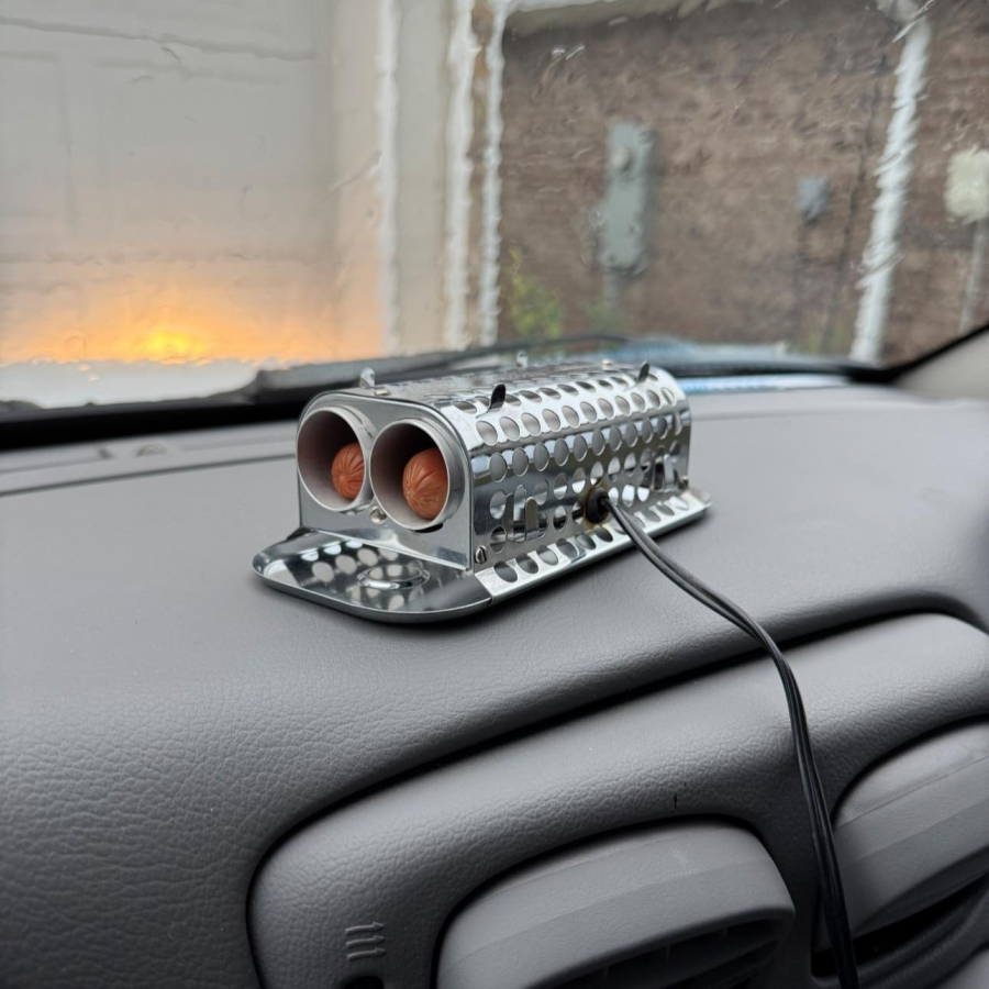 Как так вышло? Почему существует 12-вольтовая автомобильная медленноварка, но нет ни одного «сосиско-жарочного» решения? Неужели мы действительно так сбились с пути? Неужели мы утратили то немногое, что делает жизнь яркой и великолепной — например, возможность готовить хот-дог в металлической трубке прямо на торпедо?