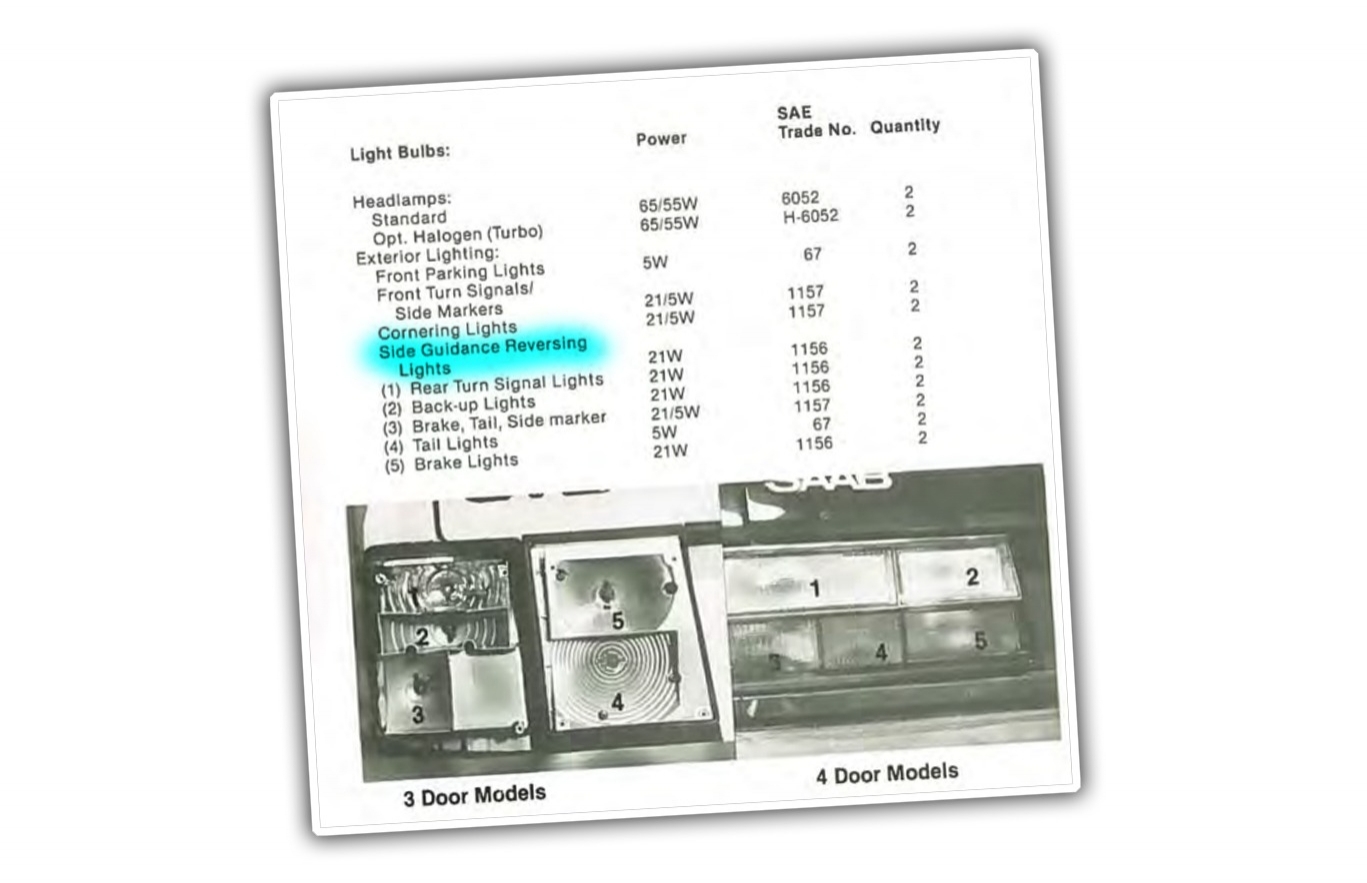 Согласно схемам ламп в руководствах по эксплуатации Saab, официально эти огни называются Side Guidance Reversing Lights, то есть боковые направляющие фонари заднего хода. Название, надо признать, очень точное. Их задача — дать дополнительное освещение именно там, где оно нужнее всего, особенно когда вы выезжаете задним ходом из тесного места в темноте.