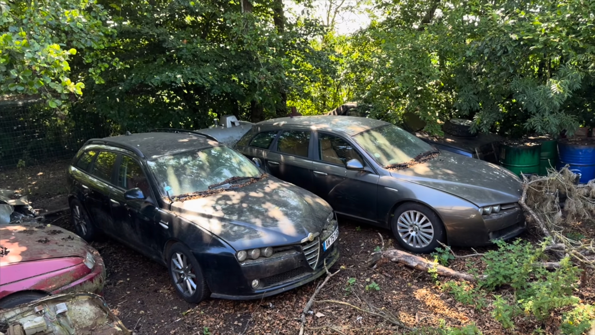 На территории разбросано несколько Alfa Romeo в различной степени сохранности. Один из самых заметных автомобилей — седан 166 с легендарным 3,0-литровым V6 Busso, оставленный под открытым небом.