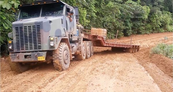 Гигантский танковый тягач Oshkosh не может подняться на размокший склон