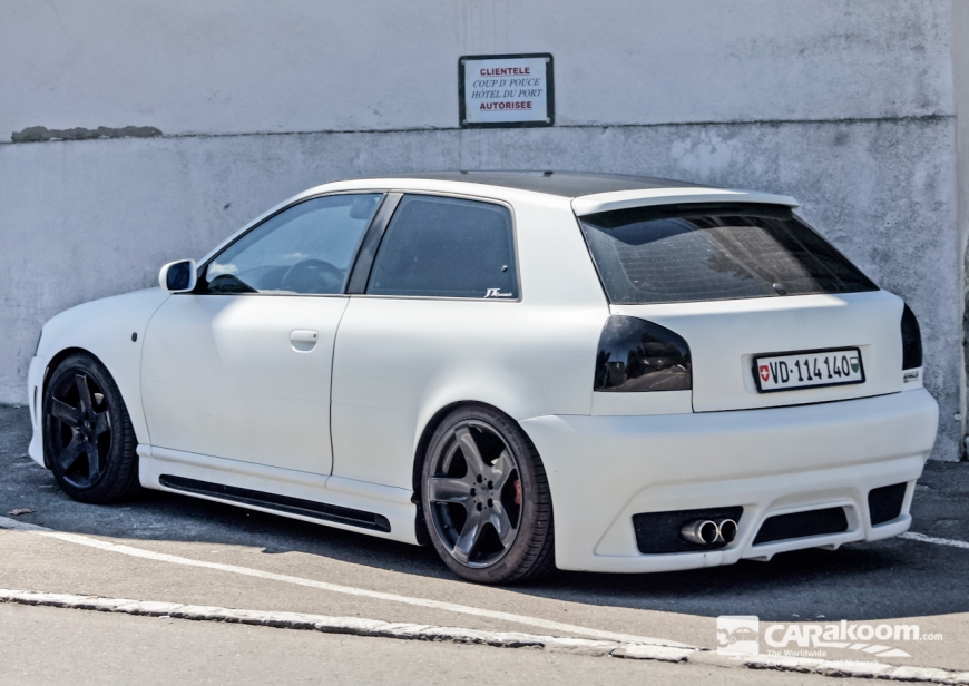 Следующий экземпляр ближе к заниженным хотхэтчам. В нем с трудом узнается Audi A3 первого поколения. Все тоже самое, но еще модифицированная выхлопная система, затемненные задние фонари, матированная белая окраска и экстремально низкая посадка. Надо сказать, что при отсутствии пневматики, увеличивающей дорожный просвет, на таком экземпляре будет сложно ездить даже на почти идеальных дорогах Швейцарии, ведь в центрах городов узкие замковые улочкам с булыжным покрытием. Видимой принадлежности к какой-нибудь известной тюнинговой фирме здесь не видно.