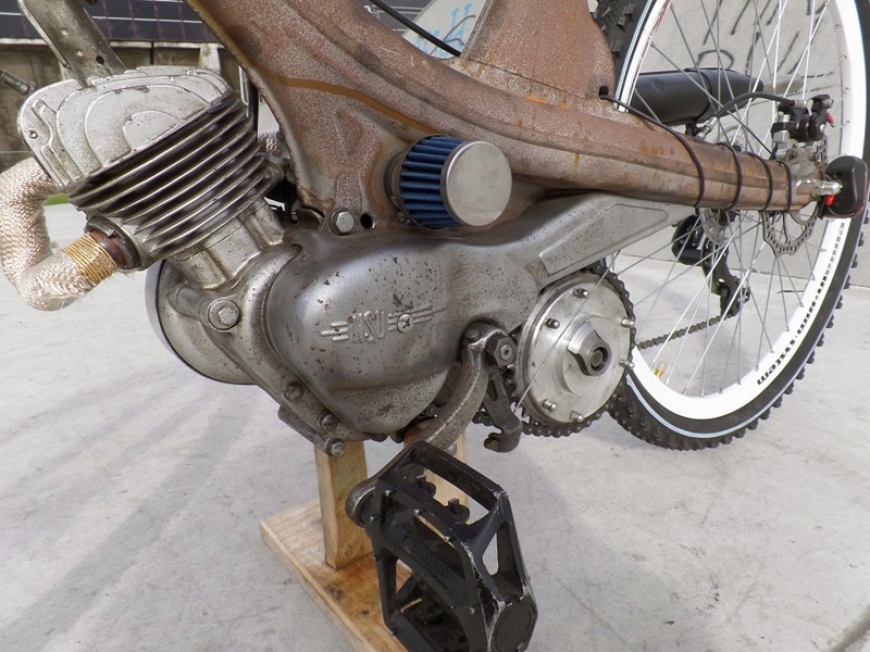 Талантливый кастомайзер из Германии, Дирк Оехлеркинг (Dirk Oehlerking) из мастерской "Kingston Custom" строит очень нестандартные мотоциклы. Но этот мопед NSU Quickly — один из самых необычных проектов Дирка. В основе - немецкий мопед компании NSU Motorenwerke AG, который выпускался в 1953-1963 года. Самая необычная деталь - это скейтборд вместо сиденья. А передняя и задняя части позаимствованы от какого-то велосипеда, в том числе колеса, вилка, руль, цепная передача и органы управления. С другой стороны, от NSU осталась рама и небольшой силовой агрегат.