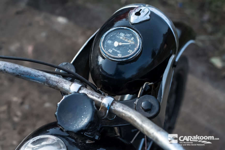 Спидометр размещен непосредственно в корпусе фары - привычное явление для послевоенных мотоциклов.