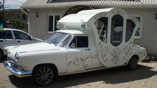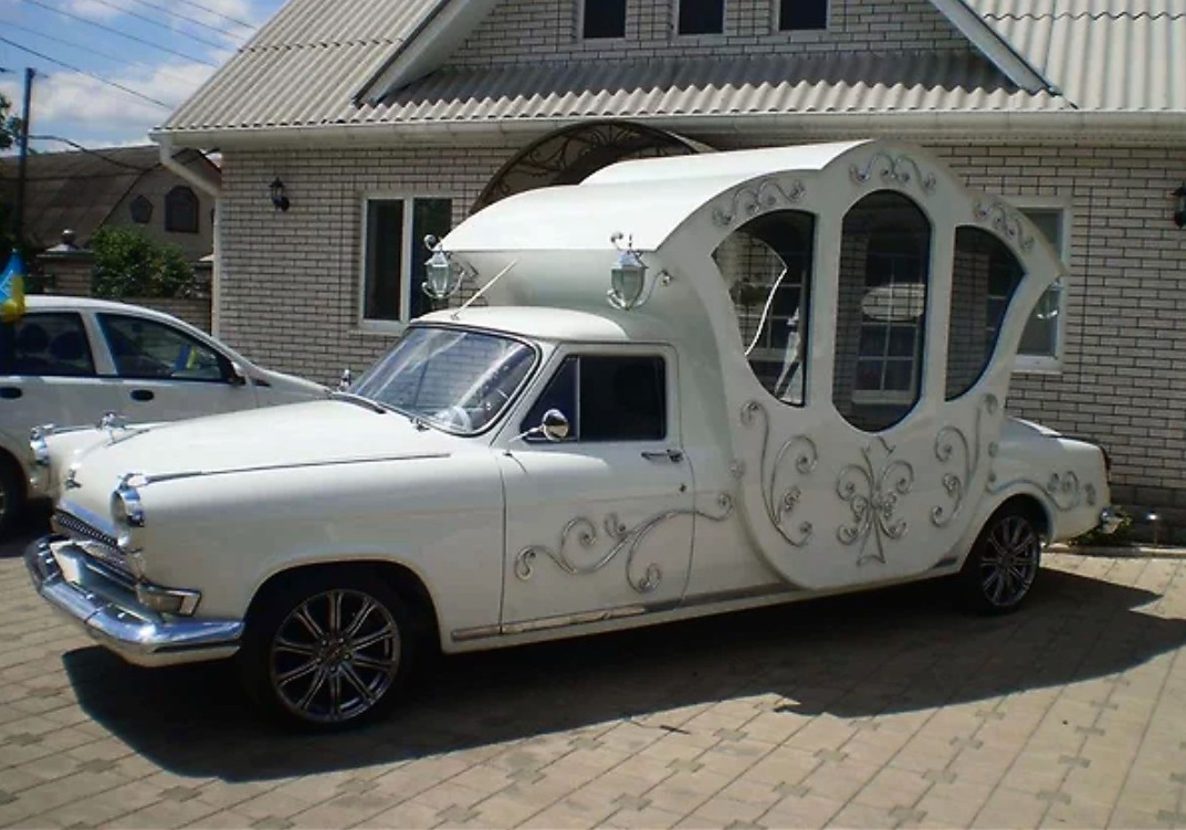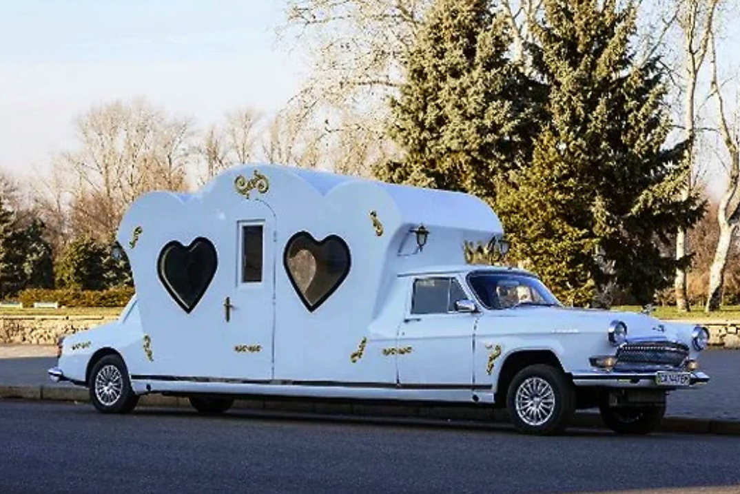 Еще один ГАЗ-21 «Волга», превращенный в современную карету. У этого экземпляра даже окошки сделаны в виде сердец. Мммм... Так мило! Нет, это отвратительно, на самом деле!