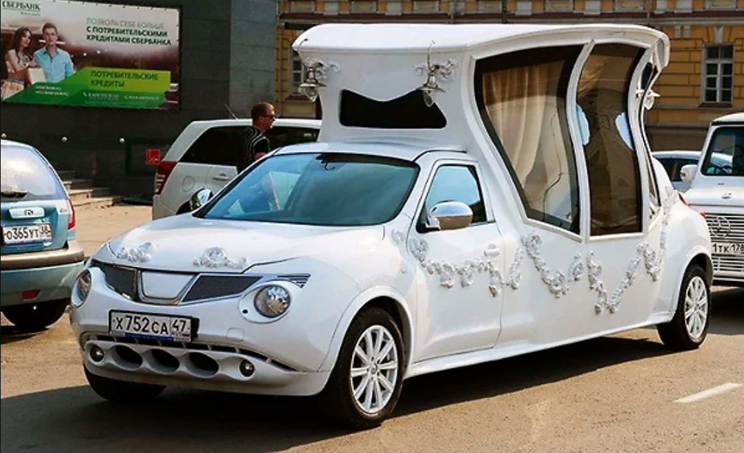 И совсем уж необычно смотрится Nissan Juke в роли лимузина-кареты. Люди, пожалуйста, остановитесь...