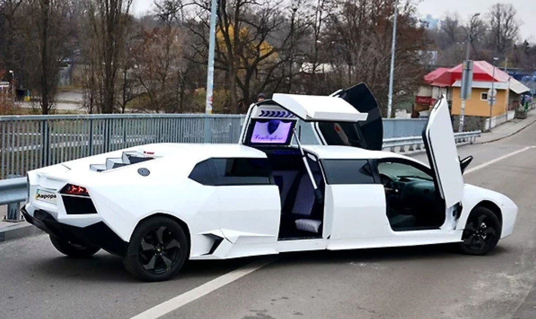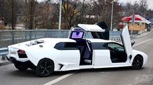 Борьба за клиента заставляет владельцев прокатных кантор создавать все более необычные лимузины. Например, реплика Lamborghini Aventador с удлиненным кузовом и поднимающимися дверьми.