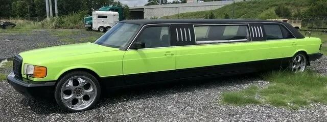 А что вы скажете про старенький Mercedes-Benz S-класса, получивший 5-метровую вставку между передними и задними дверьми? Более того, его кузов окрасили в ярко-зеленый с контрастной черной крышей, а вместо штатных колесных дисков установили совершенно ужасного дизайна хромированные "катки".
