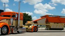 В США разрешена эксплуатация грузовиков с двумя прицепами. Поэтому владелец этого двухосного тягача Peterbilt с полностью хромированной решеткой радиатора всегда возит с собой дополнительный прицеп, идеально помещающийся на полуприцепе.