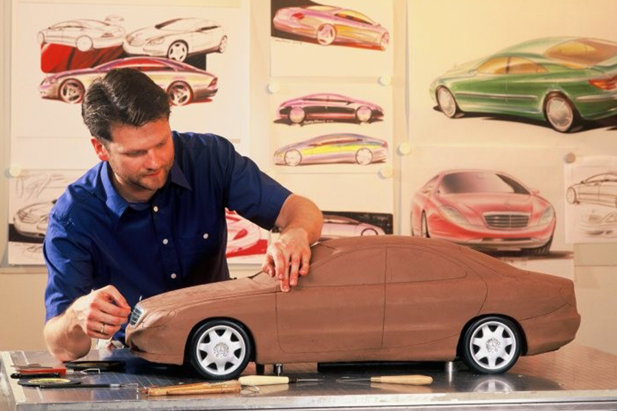Пластилиновый макет будущего Mercedes-Benz W220. Он еще слишком далек от финального образа, хотя некоторые элементы хорошо узнаваемы. Например, передние фары сложной формы.