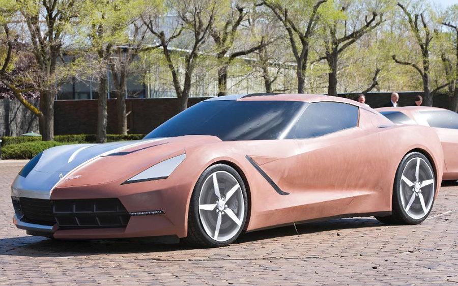 Пластилиновый макет будущего Chevrolet Corvette, разделенный на две половины с разной стилистикой. Для более детальной проработки выбран вариант справа.