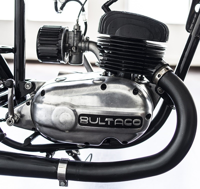 Они взяли топливный бак от Bultaco TTS, восстановили и покрасили его. Кожаное сиденье сделала местная фирма Xtrim. Передняя вилка полностью перебрана, амортизатор Yamaha Virago. 2-тактный двигатель полностью восстановлен в оригинальное состояние и отполирован. Фара также оригинальная с желтым стеклом. Ручки - Biltwell, подножки от Yamaha R1.