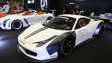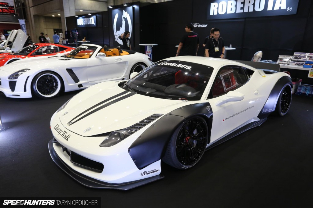 На шоу был небольшой, но впечатляющий стенд доработанных люксовых машин, в том числе машина Като-сана (Kato-san) из Liberty Walk, белоснежная 458 Italia, которая в жизни впечатляет куда сильнее, чем на фото. Скоро, кстати, вас ожидает детальный обзор этой Ferrari, так как Дино (Dino) уже успел провести с ней личную встречу.