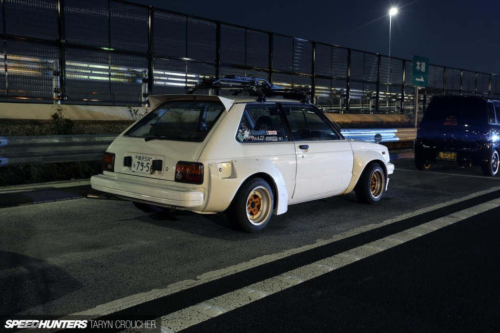 В дальнем и тёмном углу парковке я наткнулась на классную Toyota Starlet KP, выполненную в гоночном духе, с установленным обвесом N2 и комплектом классических SSR MkII. Эти машинки с квадратными ретро-арками выглядят так здорово.