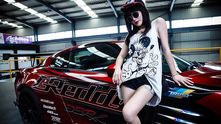 Очень качественная фотосессия очаровательной китайской девушки с навороченным вишневым Nissan GT-R. Выглядит очень впечатляюще. Обратите внимание на огромнейший задний спойлер автомобиля.