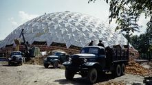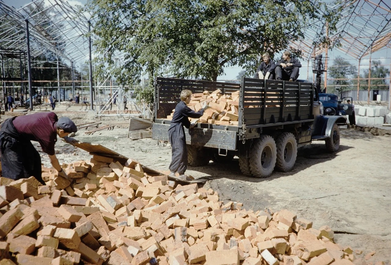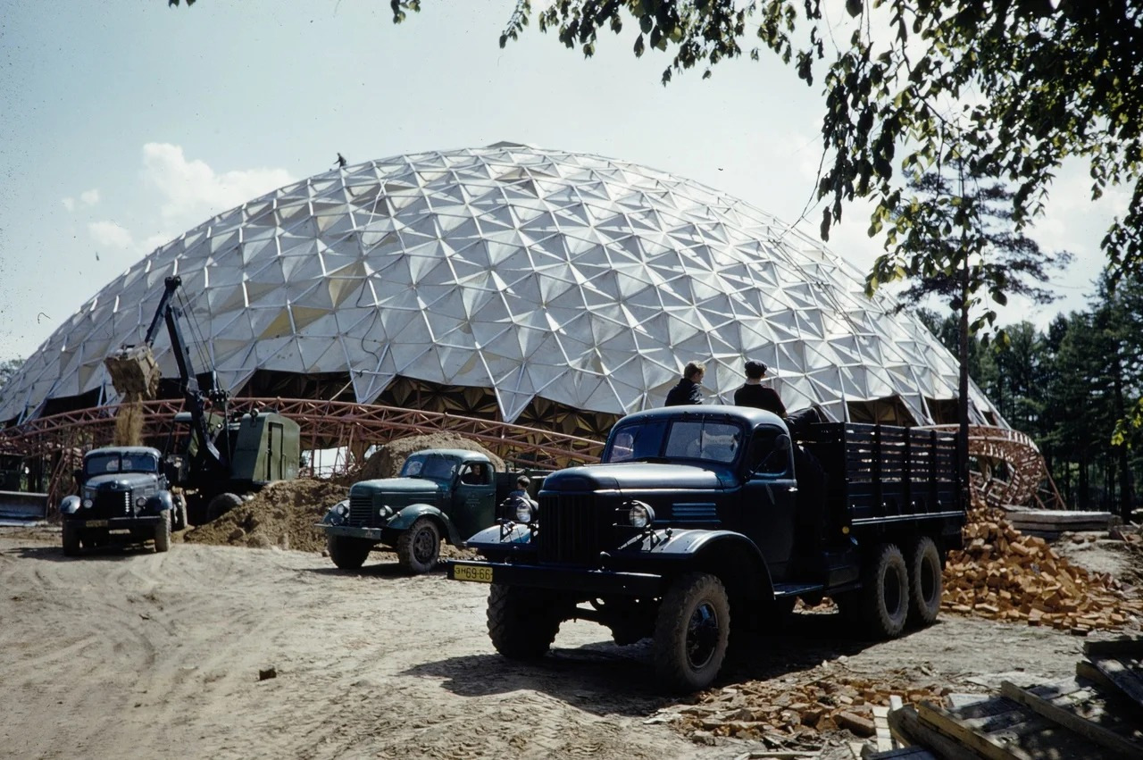 1959 год. Грузовики ЗиЛ-151 и ЗиС-150 на строительстве павильона Американской выставки в Сокольниках.