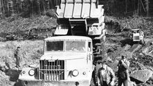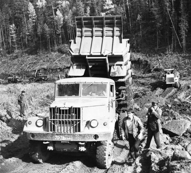 Большим стройкам были нужны большие грузовики. КрАЗы на сооружении Богучанской гидроэлектростанции.
