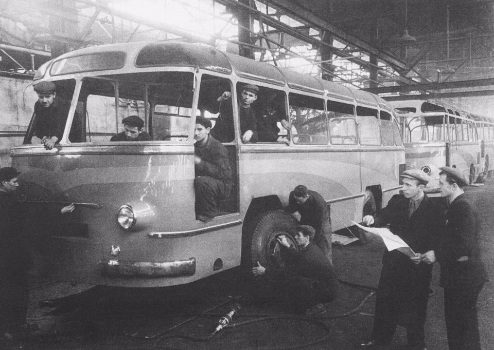 Так в 1957 году собирали автобусы ЛАЗ на Львовском Автобусном заводе. На фотографиях ЛАЗ-695 самых первых лет выпуска. Вероятно, сборка предсерийных образцов или первой промышленной партии.