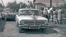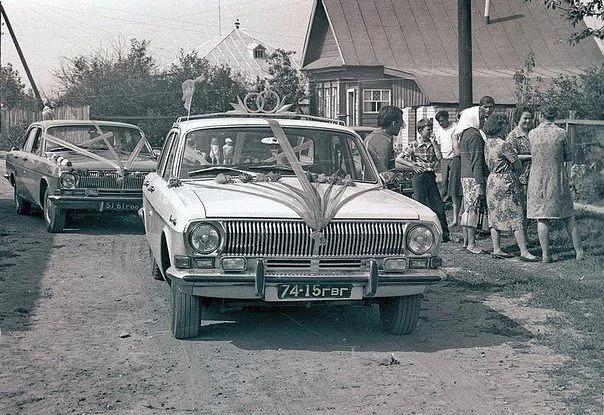Свадебный кортеж в 1979 году выглядел примерно так. Два седана ГАЗ-24 "Волга", украшенные яркими лентами. На крыше первого автомобили (видимо, для молодоженов) установлены кольца.