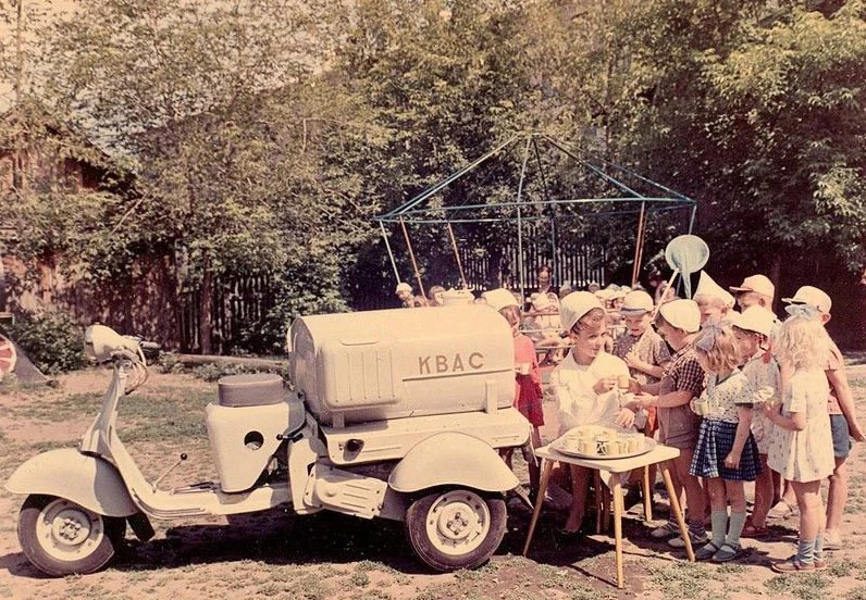 Редкий грузовой мотороллер ВГ-150 для перевозки и продажи кваса. Фотография просто зашкаливает своей милотой, начиная от мотороллера и заканчивая очередью из малышей.