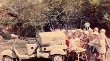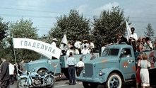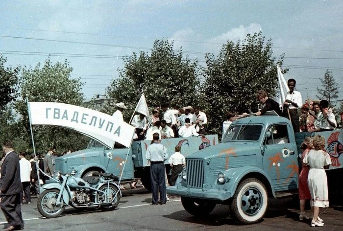 Делегация Гваделупы на Всемирном фестивале молодежи и студентов в 1957 году. На фотографии пара специально разукрашенных ГАЗ-51 и мотоцикл с коляской Ирбитского мотоциклетного завода с растяжкой "Гваделупа".