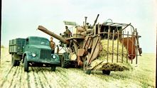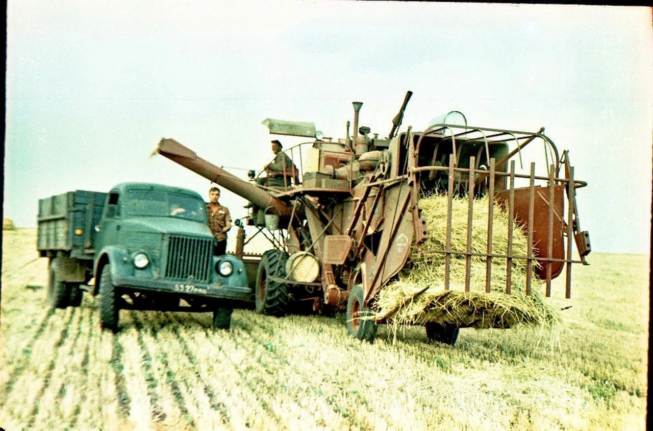 Жатва в начале 60-х годов. Комбайн еще с открытой кабиной перегружает урожай в подъехавший ГАЗ-51 с высокими бортами.