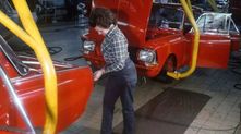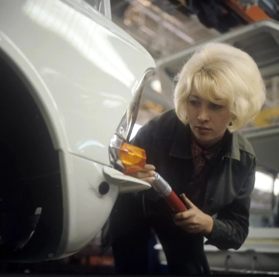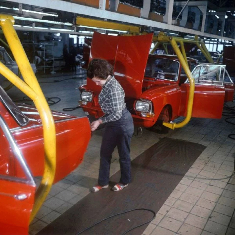 1970-е годы. Конвейер Московского Завода Малолитражных Автомобилей, где ведется сборка автомобилей Москвич-412. Пара фотографий девушек-автослесарей. Красавицы, не правда ли?