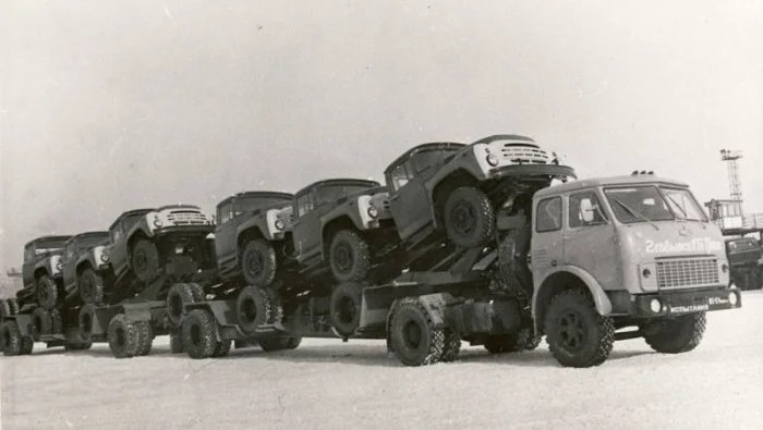 Такое зрелище доводилось видеть далеко не каждому из тех, кто жил в Советском Союзе. На фотографии специальный тягач МАЗ-5429, который занимается перевозкой грузовиков ЗиЛ-130 при помощи прицепа-платформы.