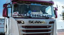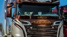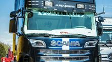 И снова Scania R500. Всё свободное пространство на передней части было использовано для размещения небольших светодиодных огней. Так что ночью он выглядит словно новогодняя ёлка.