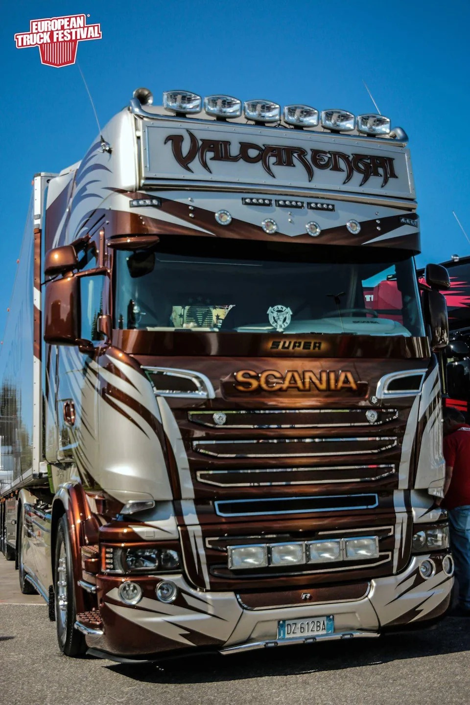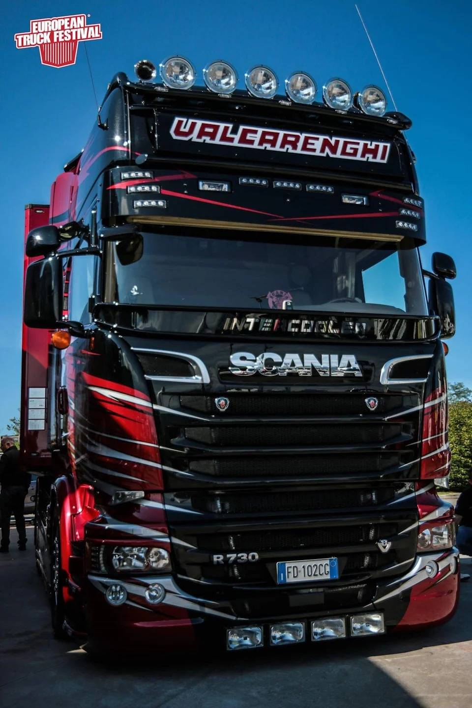 Например, этот ярко-красный красавец Scania R730 компании Valcarenghi SRL, которая производит и продает ворота и двери. На кузов и полуприцеп нанесена оригинальная аэрография, а на крыше - целых 6 фонарей.